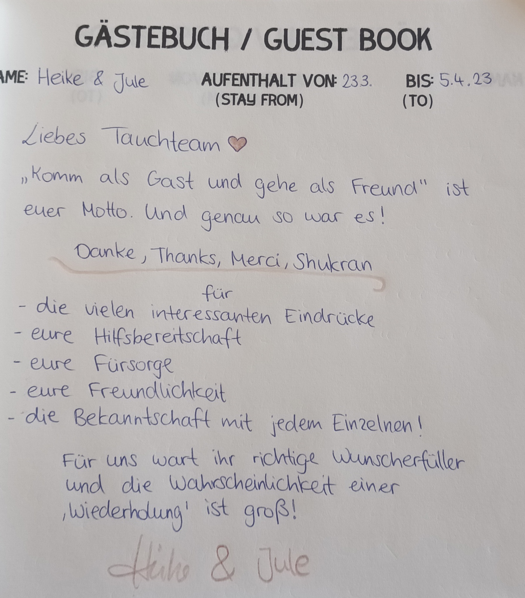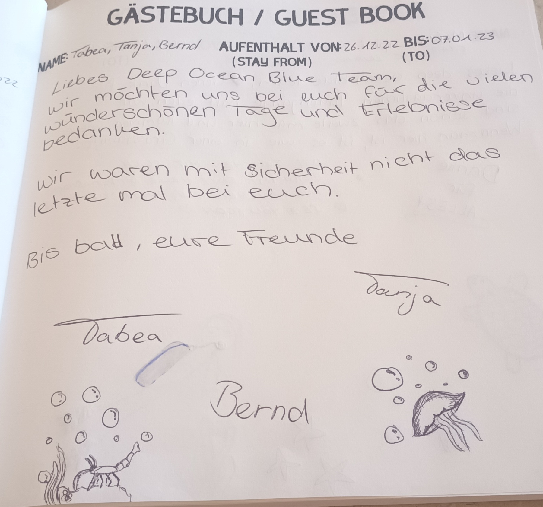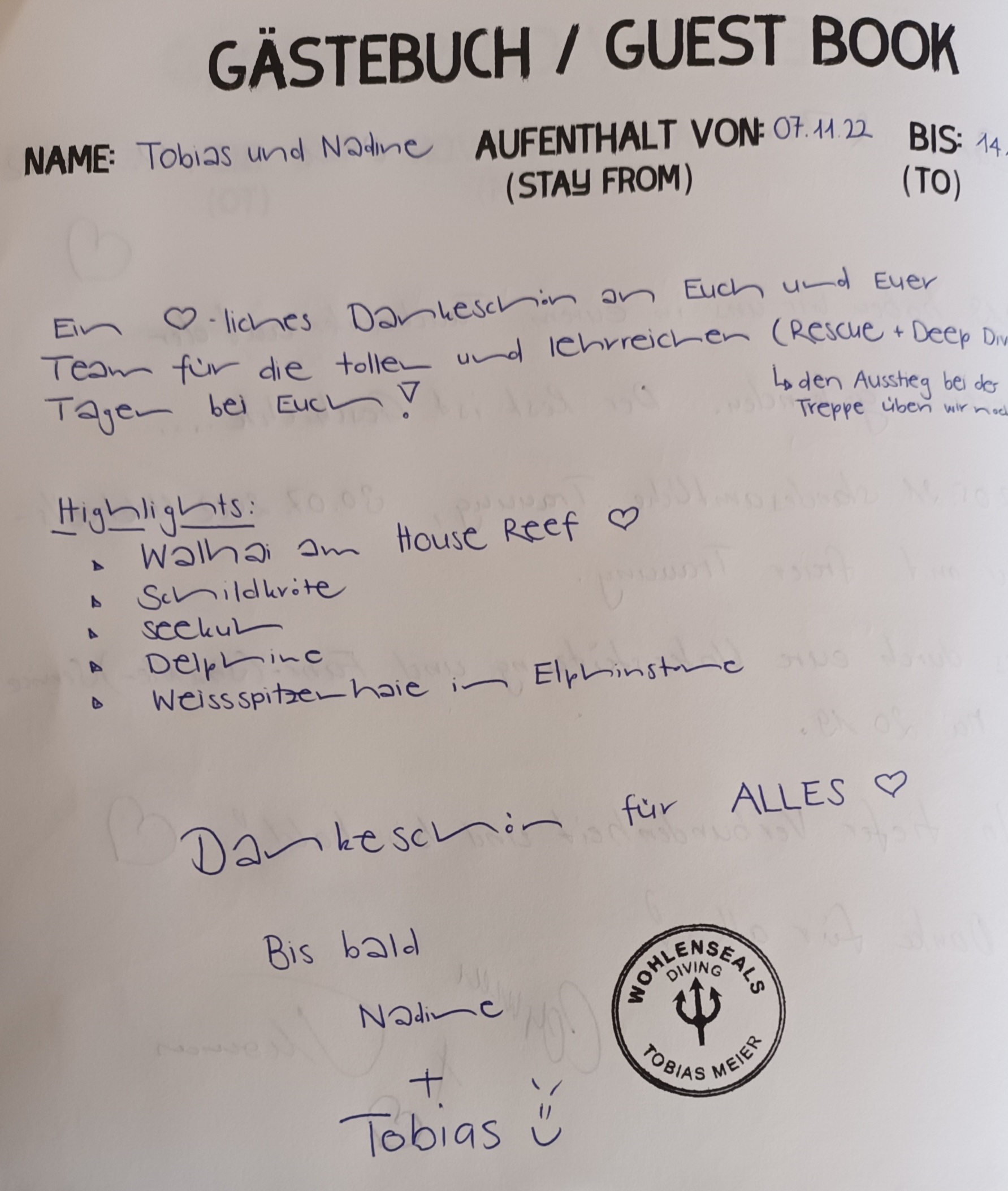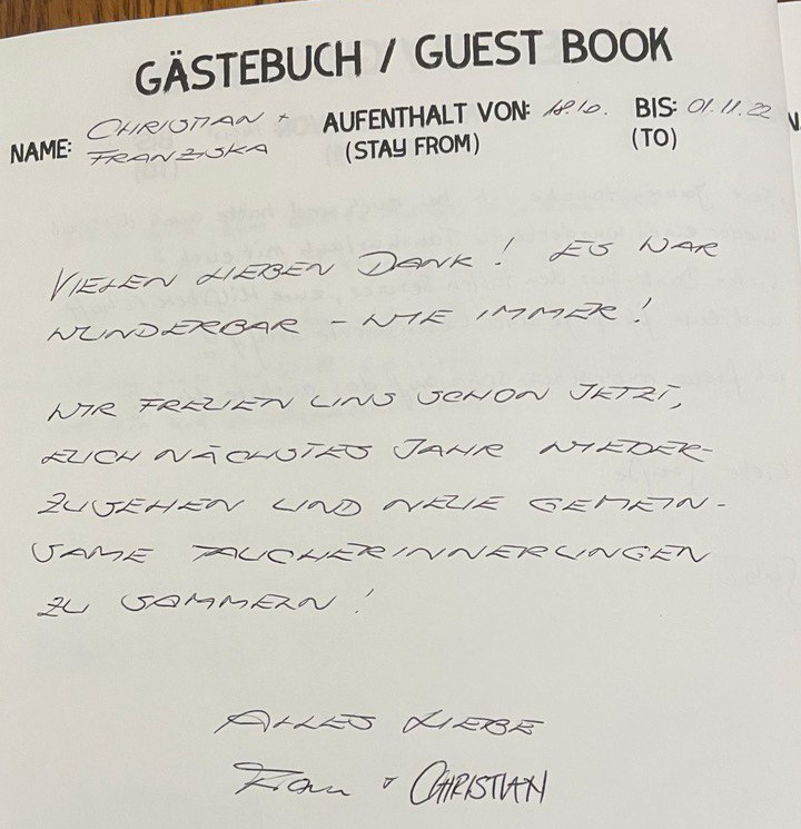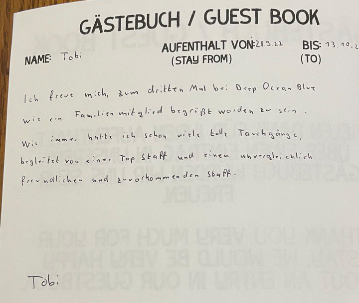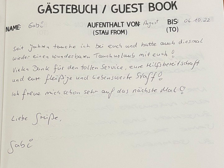 In unserem Tauchcenter liegt ein Gästebuch auf und wir freuen uns jeweils, wenn unsere Gäste dieses mit einem neuen Eintrag ergänzen.