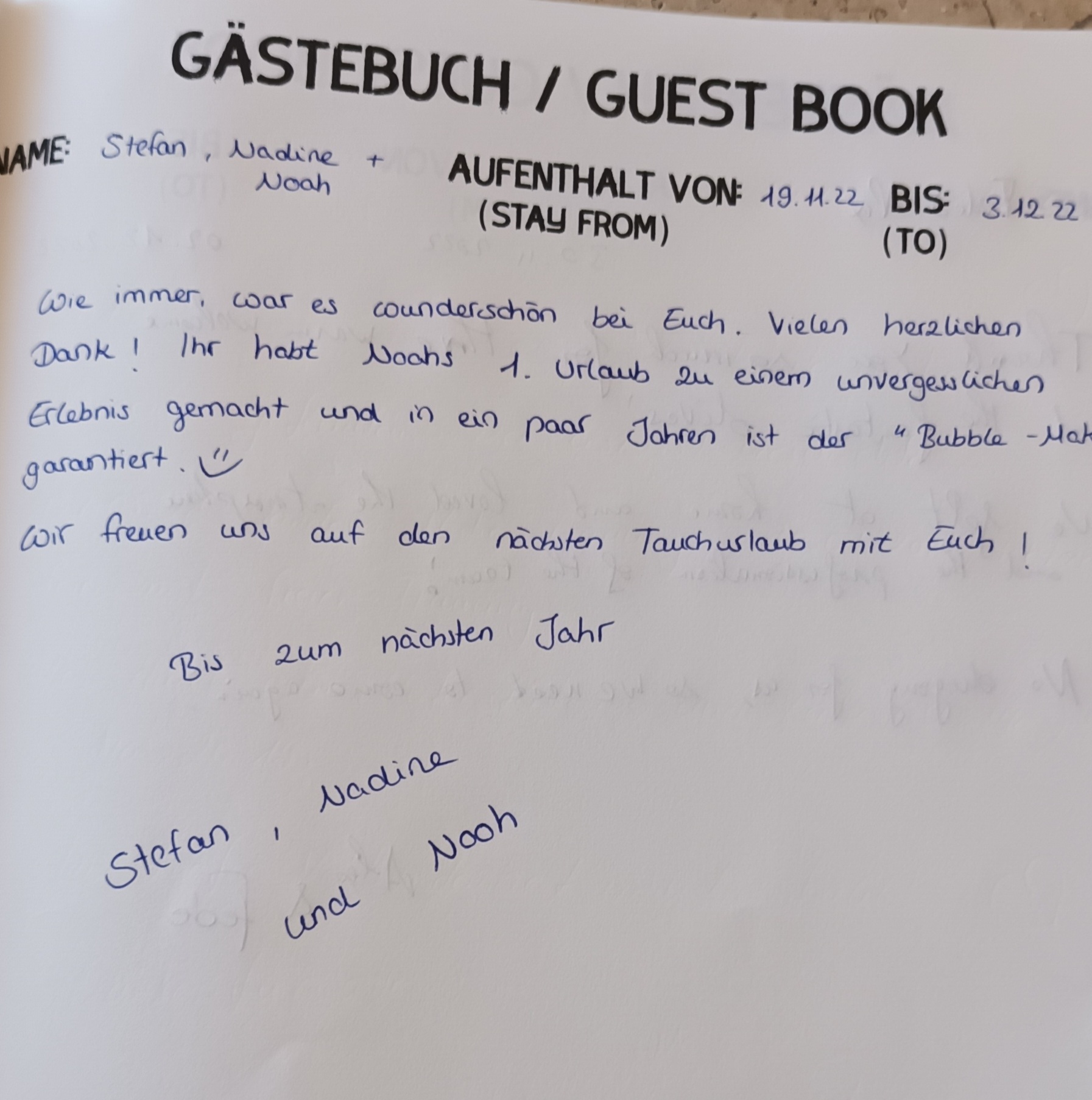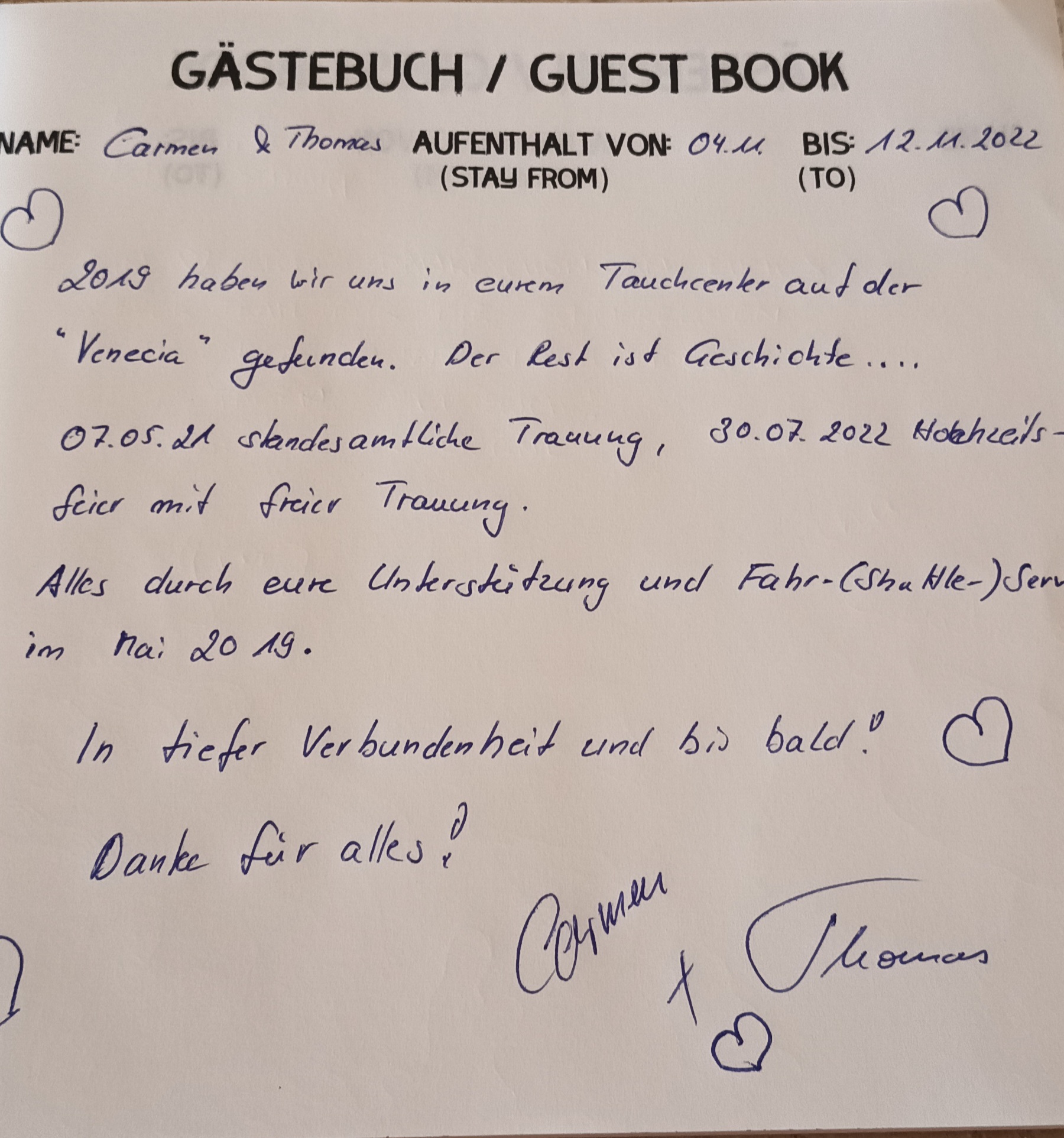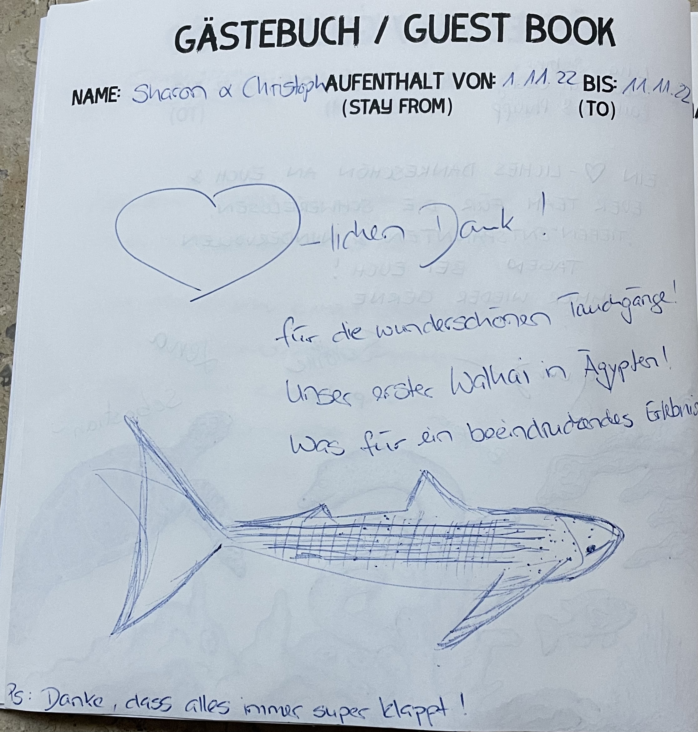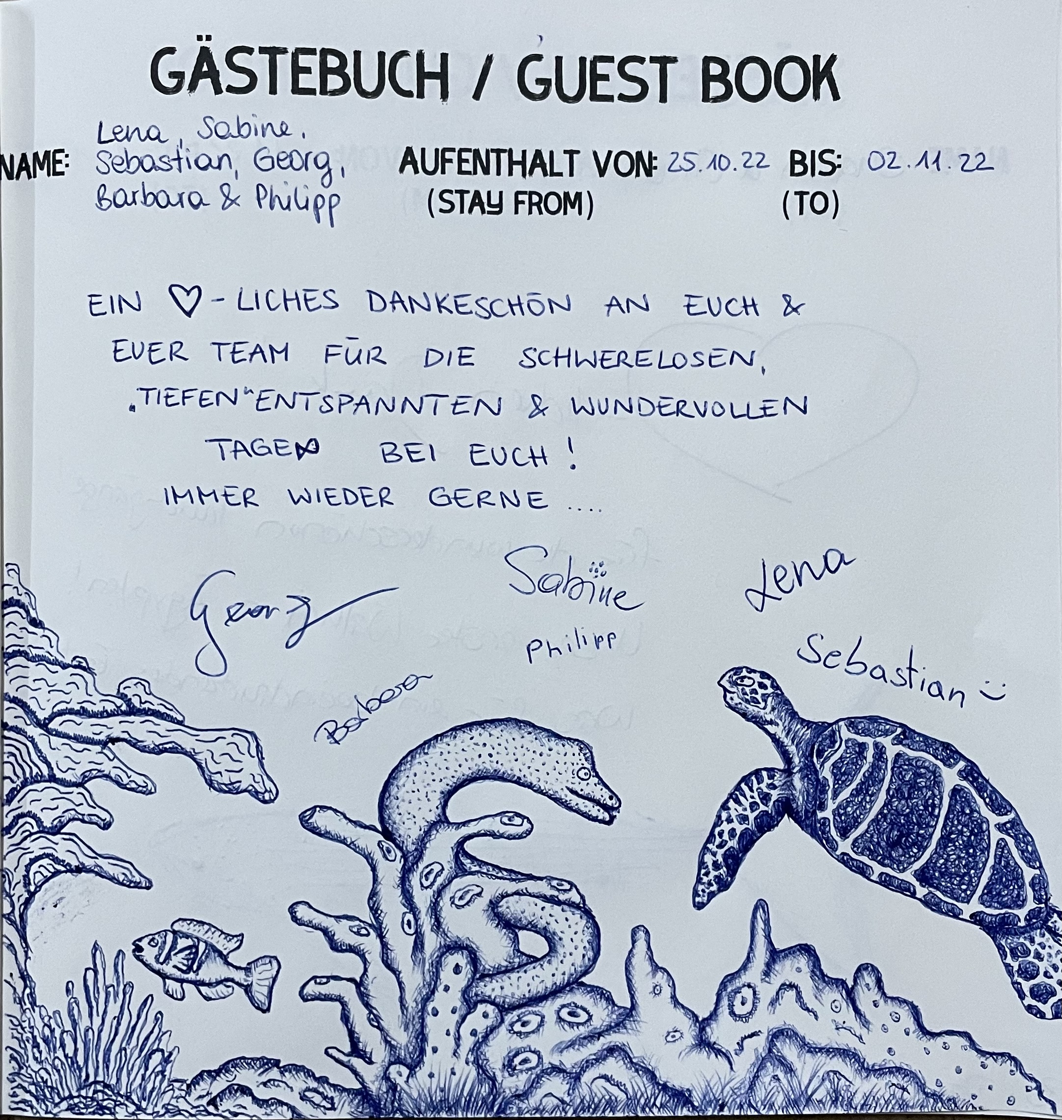In unserem Tauchcenter liegt ein Gästebuch auf und wir freuen uns jeweils, wenn unsere Gäste dieses mit einem neuen Eintrag ergänzen.